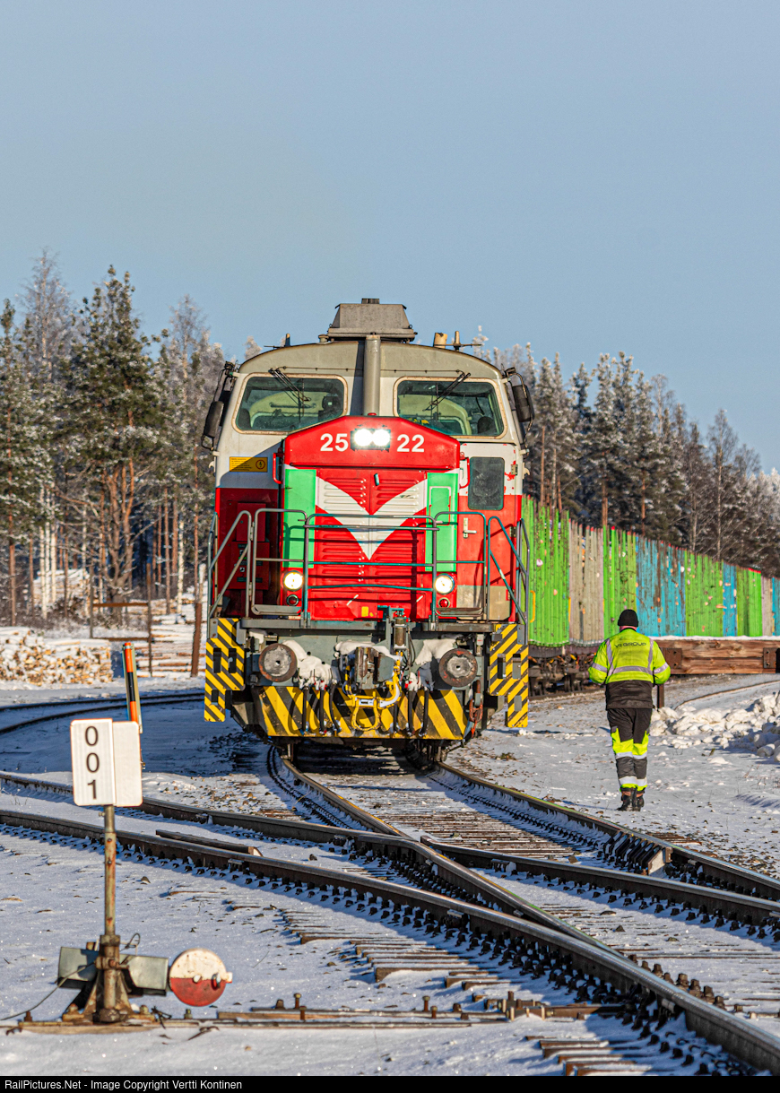 | A timber train from Pihtipudas to Jyväskylä has reached Kannonkoski, where the train has a 40 minute scheduled stop for crew rest. Here the driver of the train is seen returning to the train from a small grocery store nearby. |