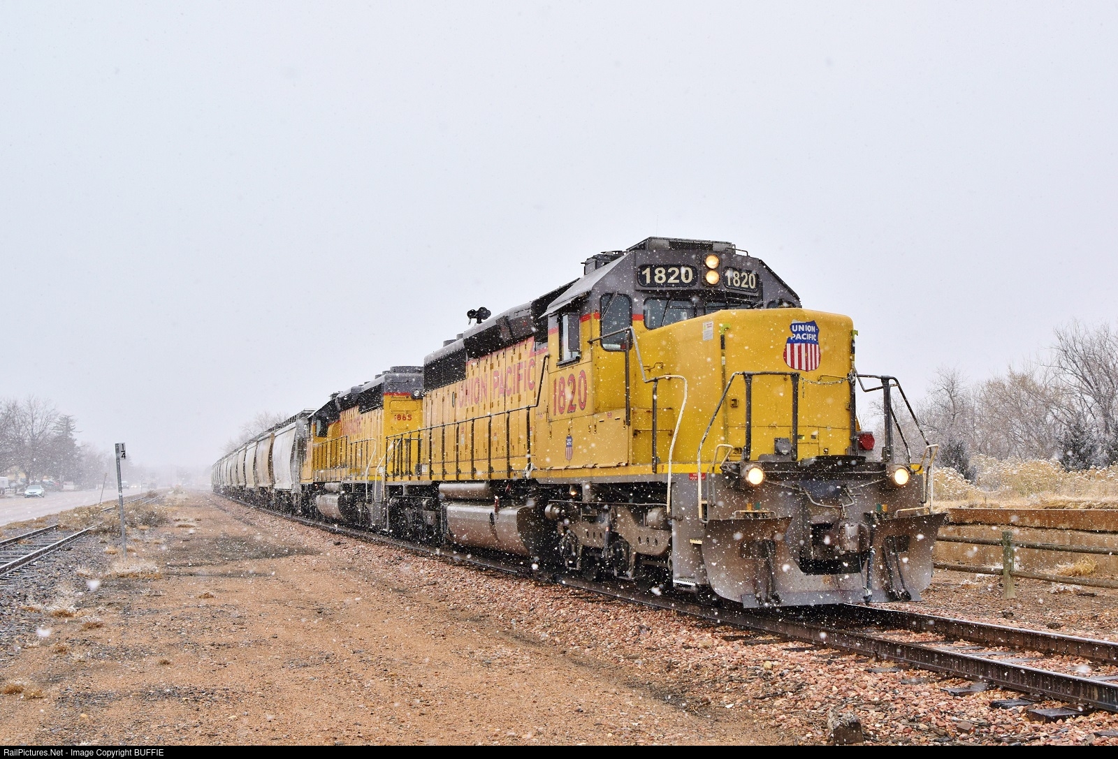 UP 1820 (SD40N) through Fort Collins, Colorado as a heavy snow falls over the City.