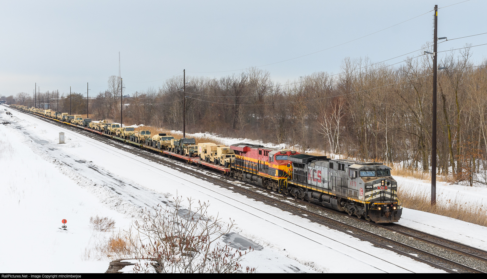 | Led by a KCSM AC4400 and a KCS ES44AC, CSX train W810 rolls east through Erie, Pennsylvania with a loaded train of military equipment in tow. Interchanged with UP in St. Louis, this train is bound for Fort Drum in New York for winter training exercises. |