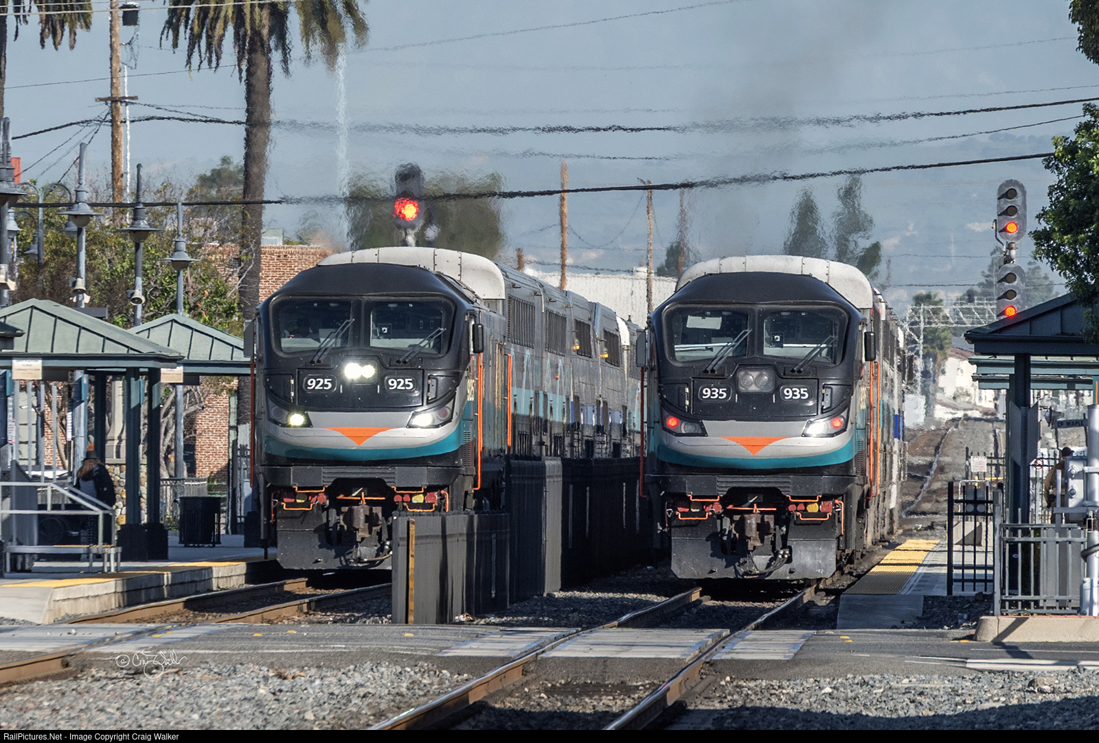 Metrolink Orange County Line train 608, pulled by F125 925, makes a stop at the station in Orange as Metrolink Orange County Line train 609, pushed by F125 935, begins heading out of the station. Train 608 is heading to Oceanside from Los Angeles, while train 609 is traveling from Laguna Niguel/Mission Viejo to Los Angeles.