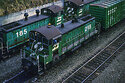 Burlington Northern Railroad 218, an EMD SW1200 that was formerly Northern Pacific 159 (built in July 1957), switches cars in the railroad’s Interbay Yard, passing a deadline of other EMD switchers as it does.