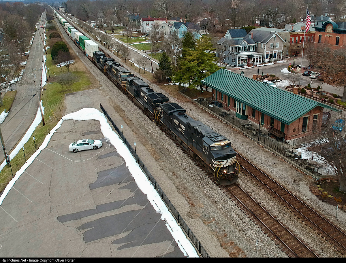 | Ponies in Glendale Northbound double stack intermodal glides through picturesque Glendale. NS and CSX have directional running between Winton Place and Hamilton; this is the CSX Cincy Terminal for all northbound traffic with the historic Glendale station to the right. |