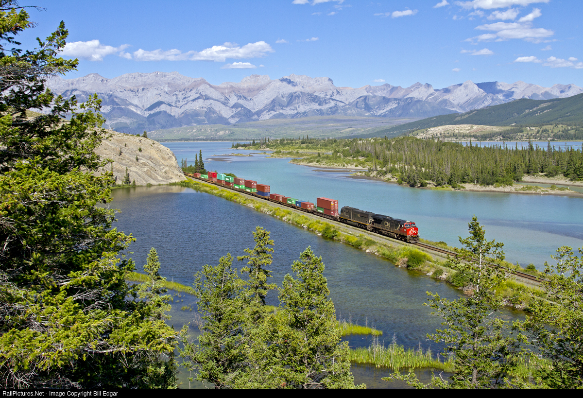 CN 2327 and an IC SD70 lead a stack train west below Windy Point along the Athabasca River in Jasper National Park east of Jasper.