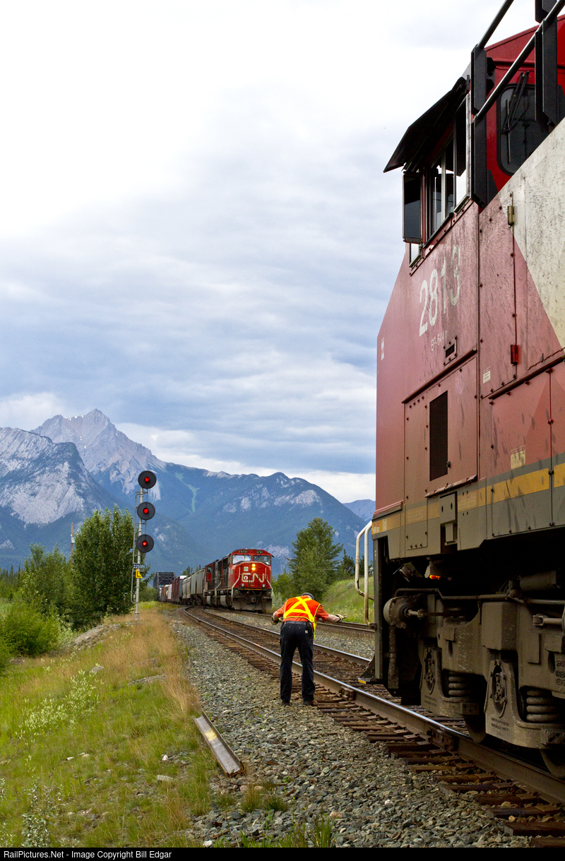 | The engineer of eastbound CN 2813 takes a bow in reverence to the engineer on the approaching train at Henry House. The westbound engineer is making his final run and will retire upon arrival in Jasper. Henry House is the end of double track running east from Jasper. |