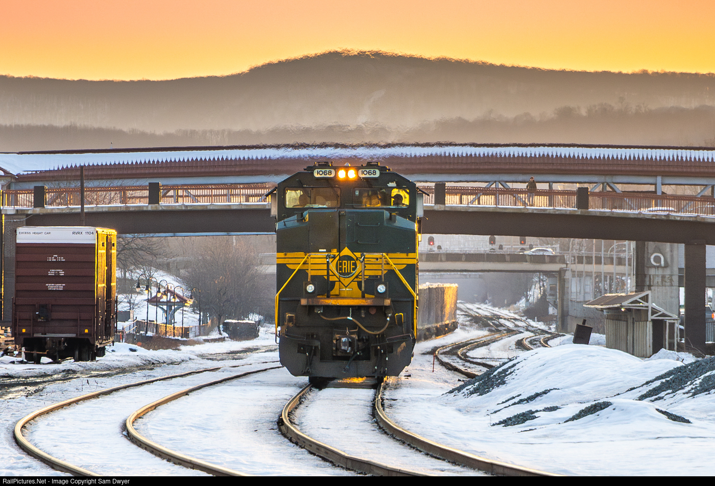 Erie at Sunset NS 1068, the Erie heritage unit, pulls 62V, trash empties bound for New Jersey east through Altoona, PA. 62V is rarely seen in daylight, but due to a derailment near Horseshoe Curve a few days prior, everything is running hours, or in some cases, days behind schedule.