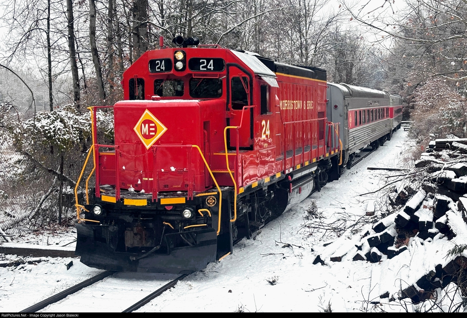 - ME 24 brings up the tail end of the Whippany Polar Express train as it heads west from the station through a wooded winter wonderland.