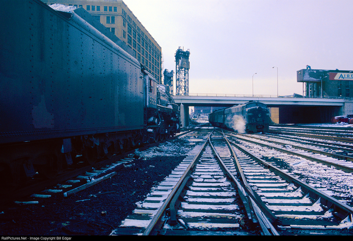 Former Penn Central E8A, AMTK 307, makes a light engine move in a maze of trackage south of Chicago's Union Station near the W. 18th St. bridge. Former Grand Trunk Western 4-6-2, owned by a private party, looks on from its storage location next to the other trackage. In the background, a lift bridge for the one time Pennsylvania RR. crosses the south branch of the Chicago River. 52 years later about the only things that are the same are the two bridges. This area is at the south end of Amtrak's large Chicago facilities. Even the buildings have changed.