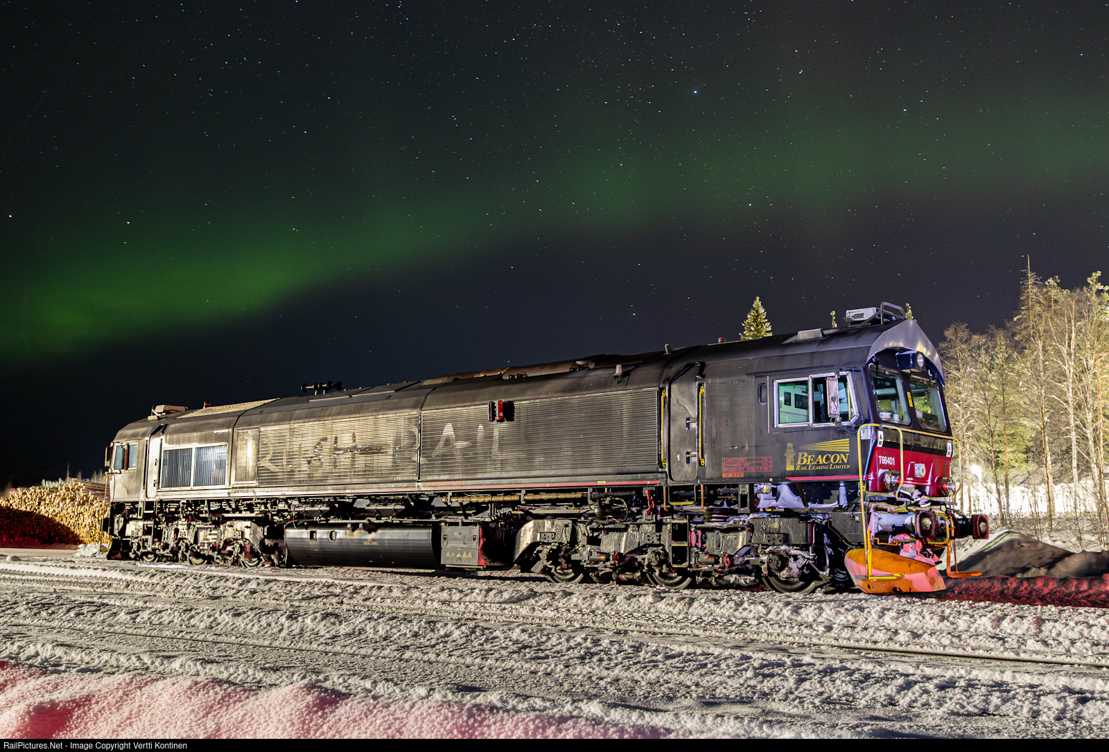 | It's a cold february night in Storuman under the northern lights. The distinct sound of EMD 710 2 stroke V12 hums idle in the empty timber terminal, echoing from inside a Beacon Rail Leasing T66 locomotive, a Swedish version of the legendary Class 66 delivered to almost all corners of Europe! The locomotive, leased to Hectorrail, brought a train of empty timber cars in the afternoon and will take them back loaded the next morning. |