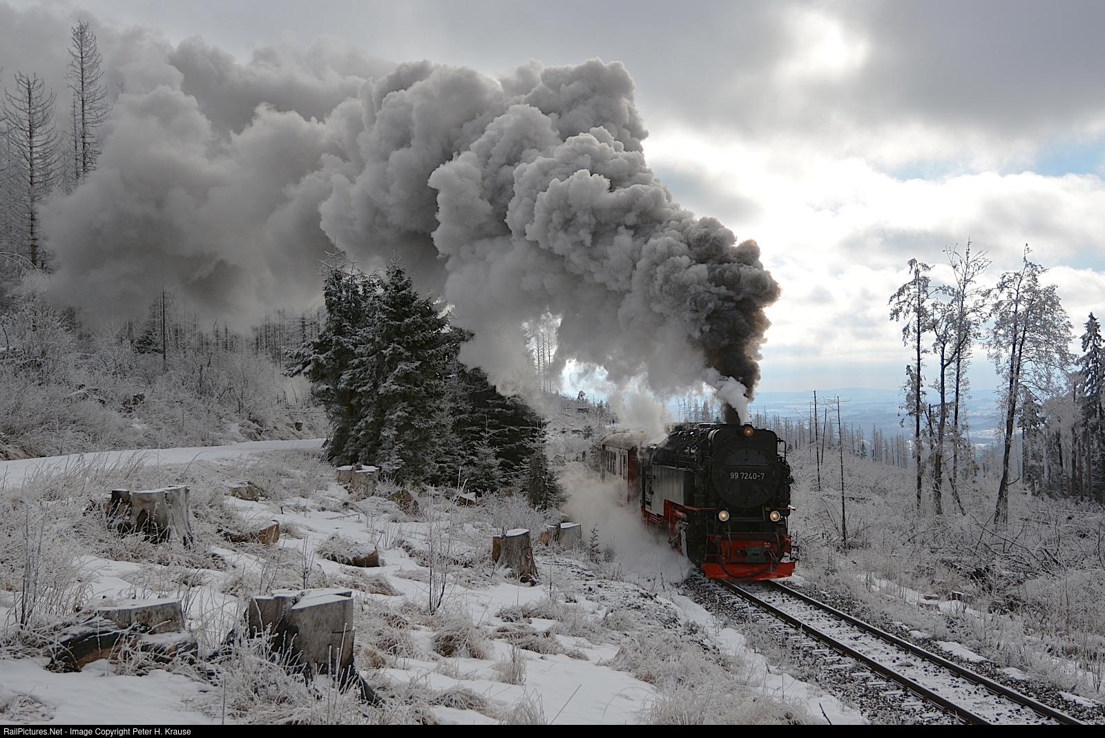 | The first train of the day to the Brocken mountain is always the hardest to handle. Overnight some fresh snow has fallen and 99 7240 is doing its best on this crispy cold winter`s day on the Brockenbahn. The train is seen here west of Schierke station, heading to the mountain top. |