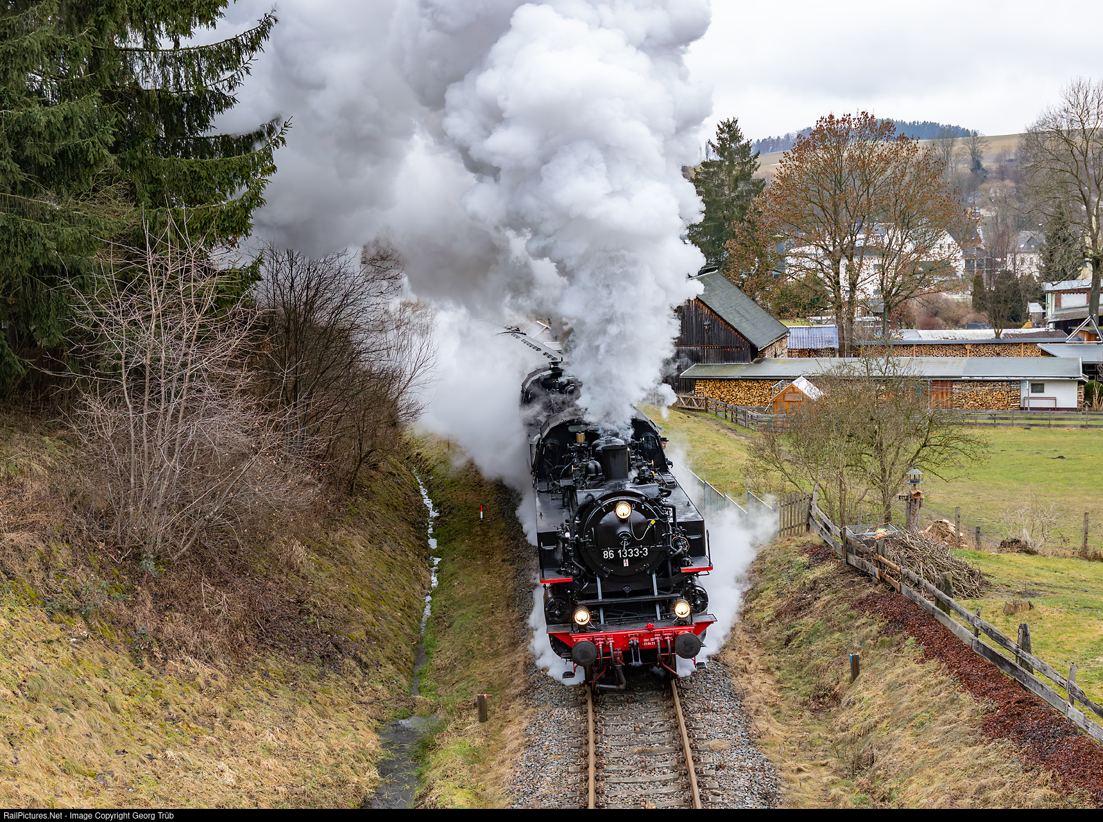 | The two 2-8-2 tank engines 86 # 1333 and # 1744 of the PRESS pull the DRC 20965 of the IGE Erlebnisreisen out of Markersdorf, on the trip from Zwickau through the Erzgebirge to Flöha. This was part of the 4-day trip "Winter steam in Saxonia" of the IGE. |