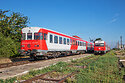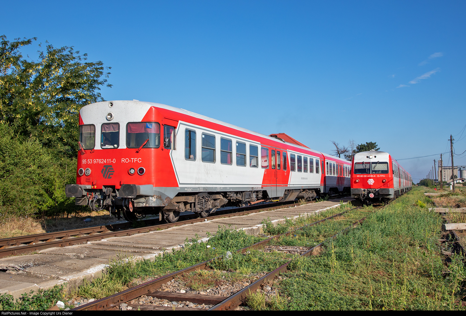 | The three-car diesel multiple unit, with the leading unit 76 2411, of TFC Transferoviar Calatori, operating as train IR 10273 from Titan Sud Hm. to Oltenita, crosses paths with the opposing train 614 030 in Budesti. The DMU 76 2411 is a former Class 624 multiple unit of the German Federal Railway (Deutsche Bundesbahn). |