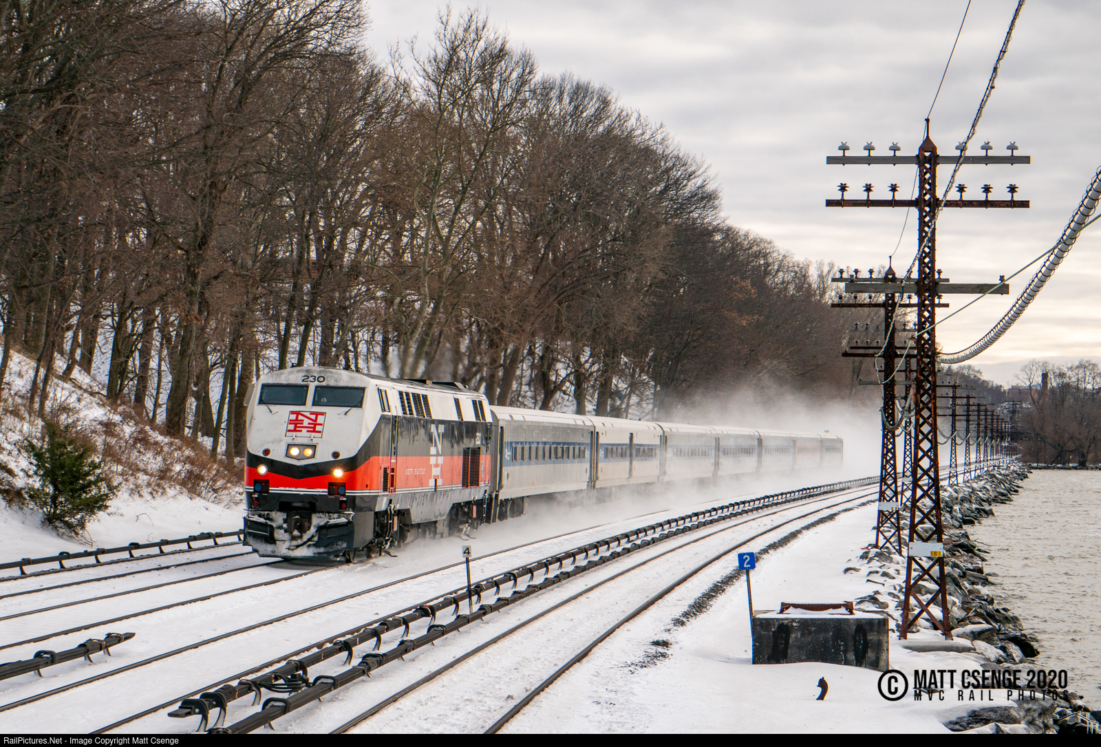 Metro-North Railroad P32AC-DM no. 230, one of the New Haven heritage units, blasts up the Hudson Line with a trail of powder flying behind it. |