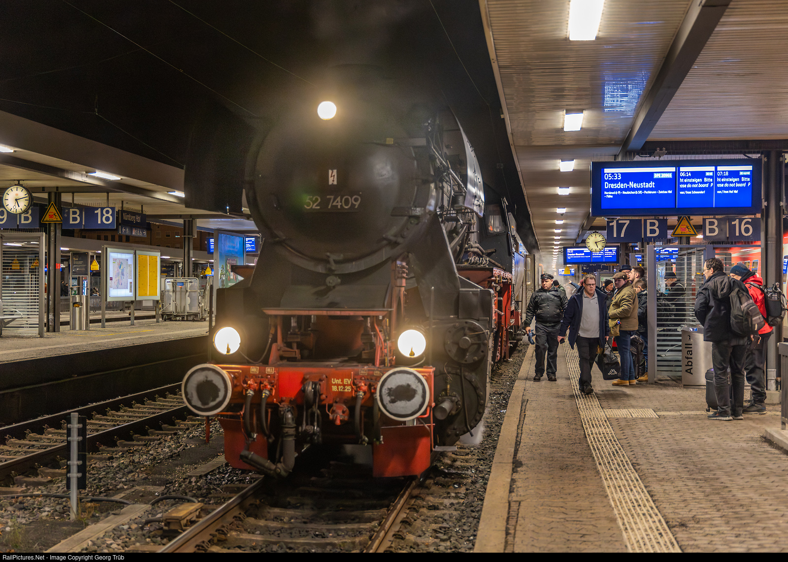 | It's very early in the morning, 05.12 AM, in Nürnberg main station. The steam train DRC 20965 of the IGE Erlebnisreisen to Dresden Neustadt with 2-10-0 freight train steamlocomotive 52 # 7409 of the Eurovapor (owned by the town of Würzburg) is ready for departure at 05.33 AM. |