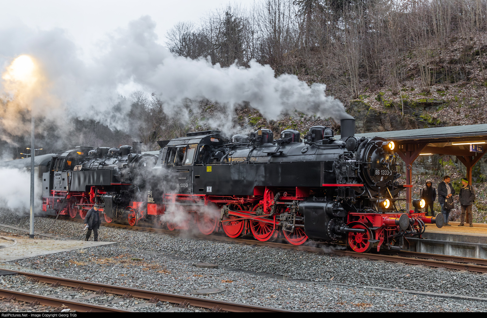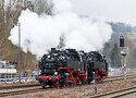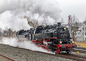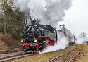 | The "Winter Steam in Saxonia" train DRC 20695 of the IGE Erlebnisreisen from Nürnberg to Dresden Neustadt reached Wolkenstein for taking water. Tank engines 86 # 1333 and # 1744 of the PRESS are in front of the train between Zwickau and Flöha. |