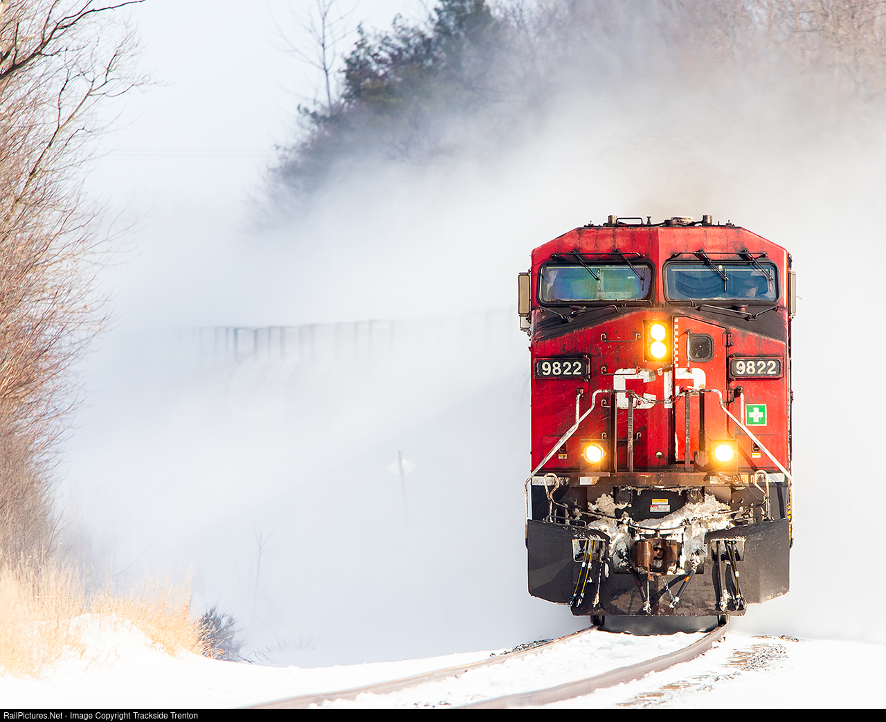 | Canadian winter railroading in full swing as CP 9822 leads a late morning westbound into Brighton kicking up fresh snow along the way. |