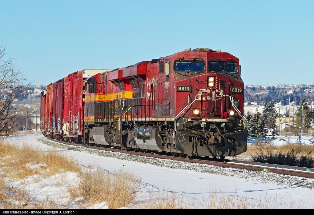 | Nice day, dirty train. CP 8819 leads train 200 east in Calgary. Calgary got a nasty dose of winter earlier in the week. On this day, it was fairly pleasant at only about -8 celsius. |