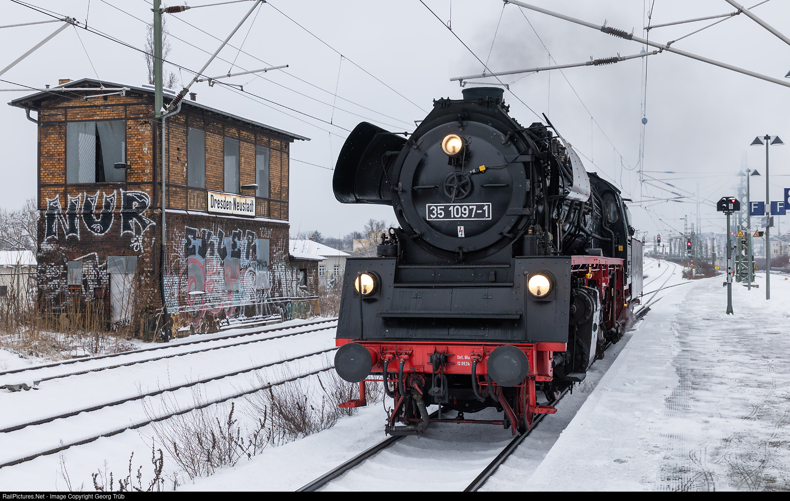| The 2-6-2 passenger trains steamlocomotive 35 # 1097 of the IG Traditionslok 58 3047 e.V. in Glauchau is running around her train in Dresden Neustadt. The locomotive with 110 km/h maximum velocity was built in 1959 by VEB Lokomotivbau "Karl Marx" in Babelsberg as 23 # 1097 for the Deutsche Reichsbahn of the GDR (German Democratic Republic). The 35 # 1097 pulled the steam special DRC 93579 of the "Winter Steam in Saxonia" round tour of the IGE Erlebnisreisen from Dresden Neustadt to Gera via Chemnitz-Glauchau this day. |