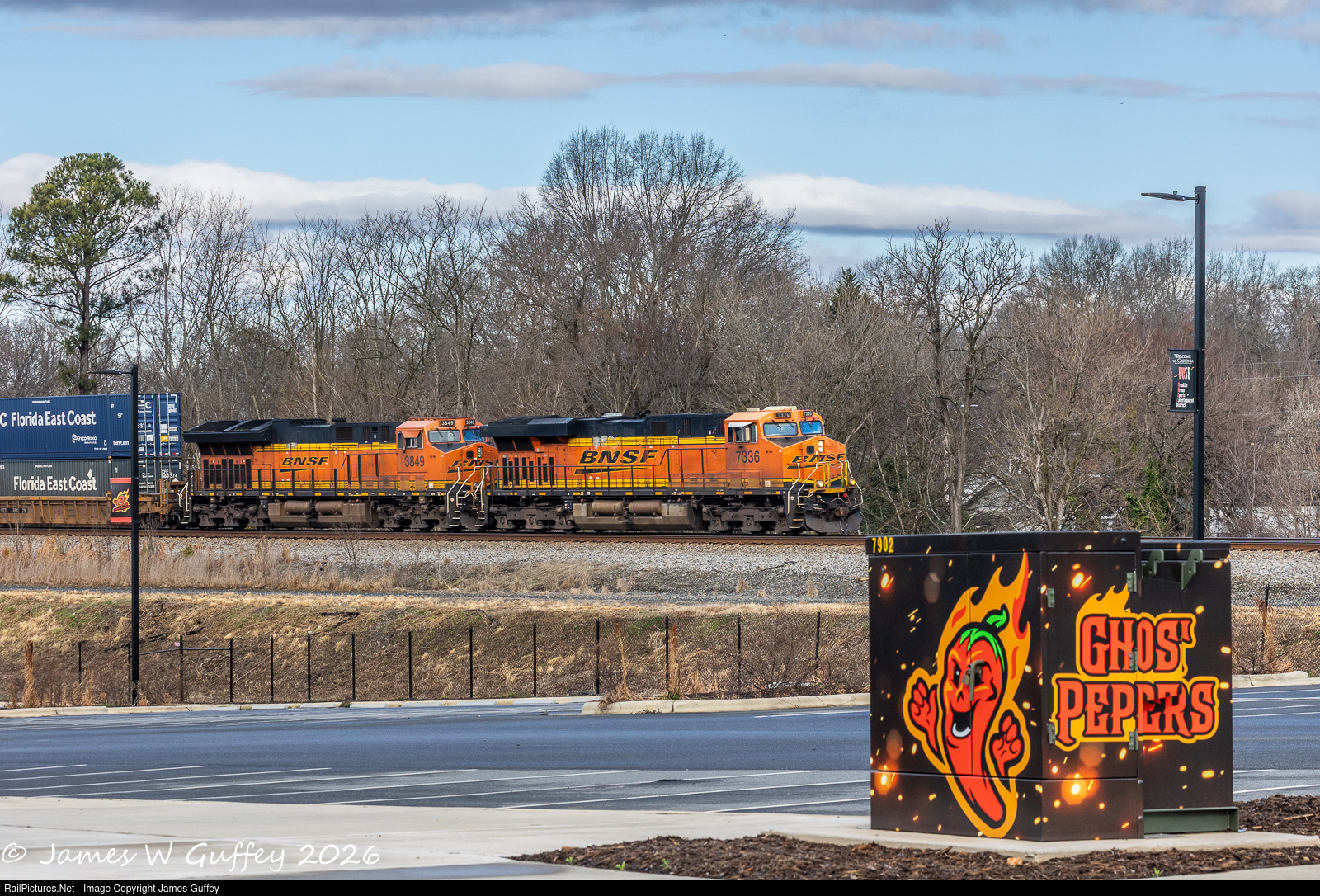 | A late 240 heads northward toward it's destination at Charlotte, passing the home of the Gastonia Ghost Peppers, an independent minor league baseball team. The mascot Peppy is not quite as fierce as depicted on the transformer enclosure. |