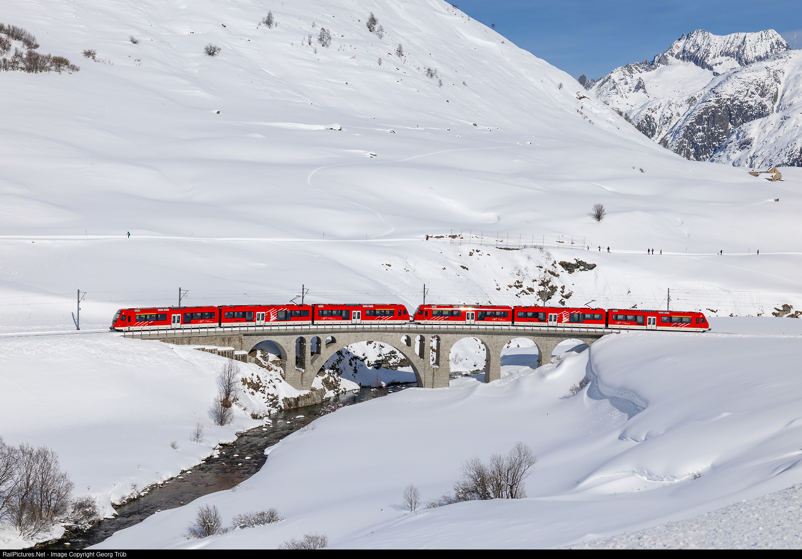 | "Orion" cogwheel trains ABeh 8/12 # 309 and # 304 of the Matterhorn-Gotthard-Bahn (MGB) in multiple control are crossing the Richleren viaduct over the Furkareuss between Hospental and Realp, running as regional train 545 of the line R43 from Andermatt to Visp. |