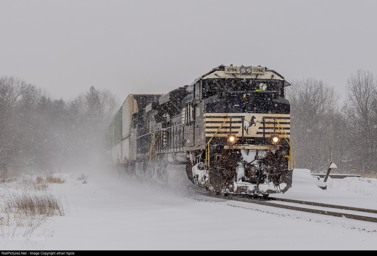 NS 1094 leads a late running Z264 eastbound through a snow storm.
