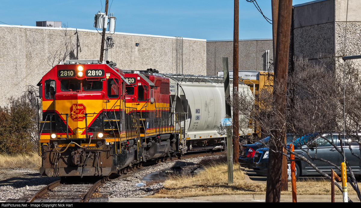 | After spotting cars at WSI, KCS 2810 rocks and rolls around the curve with the day's Metro 1 Dodger. |