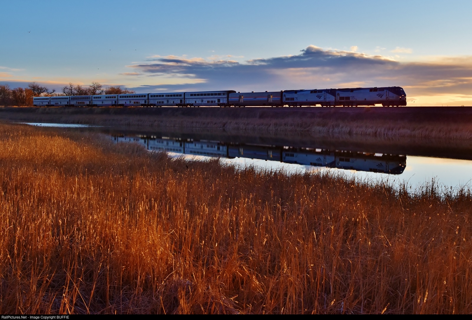 The sunrise kisses off the grasses as the California Zephyr runs past Barr Lake in Brighton, Colorado.