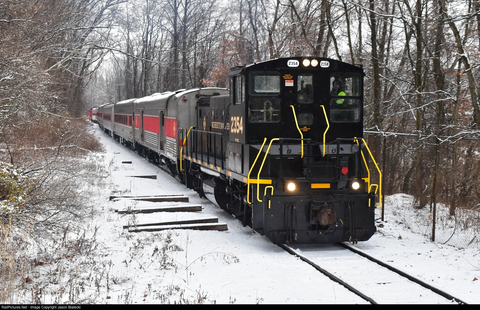 | It's Beginning to Look a lot Like Christmas - The M&E Polar Express Train is heading west from the Whippany Station and is passing through a wooded, snow covered scene as it slowly rolls to Cedar Knolls. |
