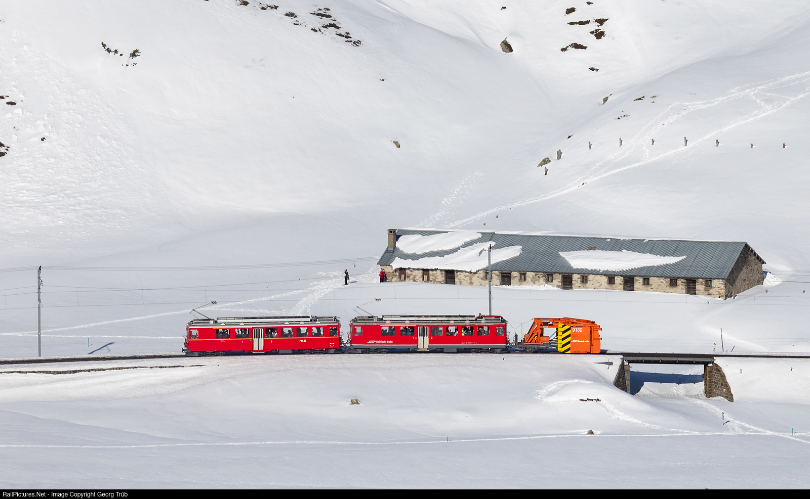 To show how snow fighting on the Bernina line was executed decades ago, the Rhaetian Railway organised the snowblower adventure trip. The about 60 participants are riding in the railcars ABe 4/4 # 46 "Goldliner" and # 47 in multiple control, pulling the snow scratch Xk # 9132. The consist is passing the large building of Alp da Buond Sur between Bernina Lagalb and Ospizio Bernina.