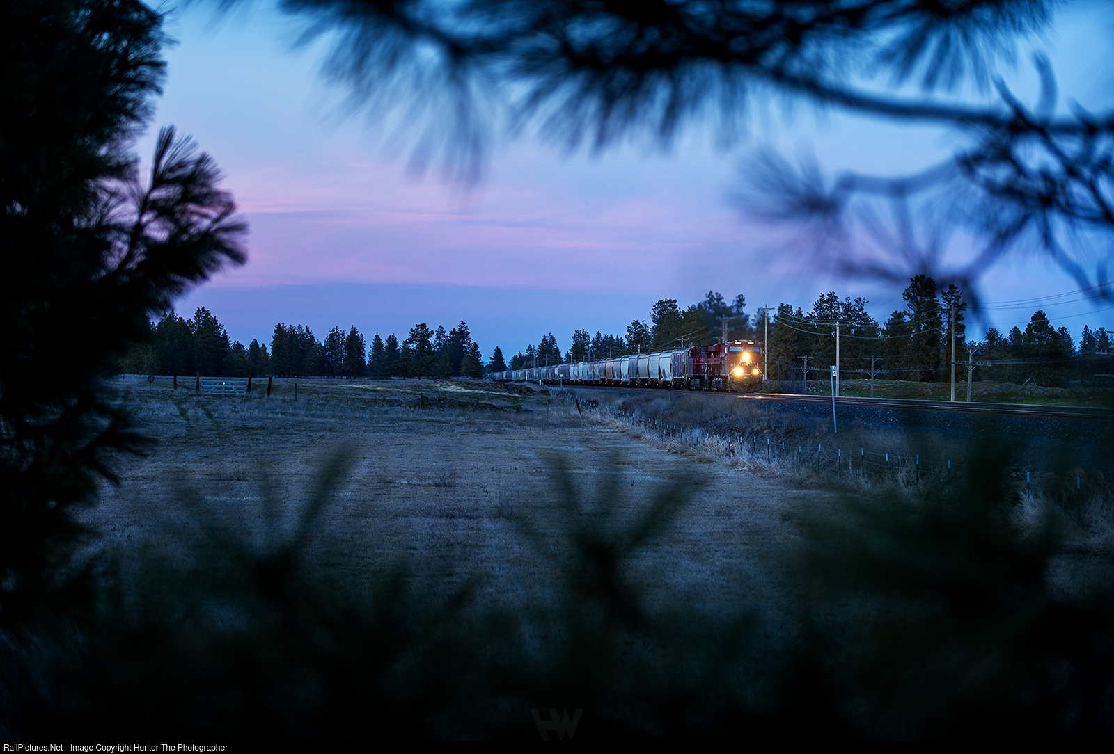 Pink Sky Pines | Beneath a colorful sky on the evening of Saturday, February 28, 2026, a southbound grain train makes its way out of Cheney, WA.