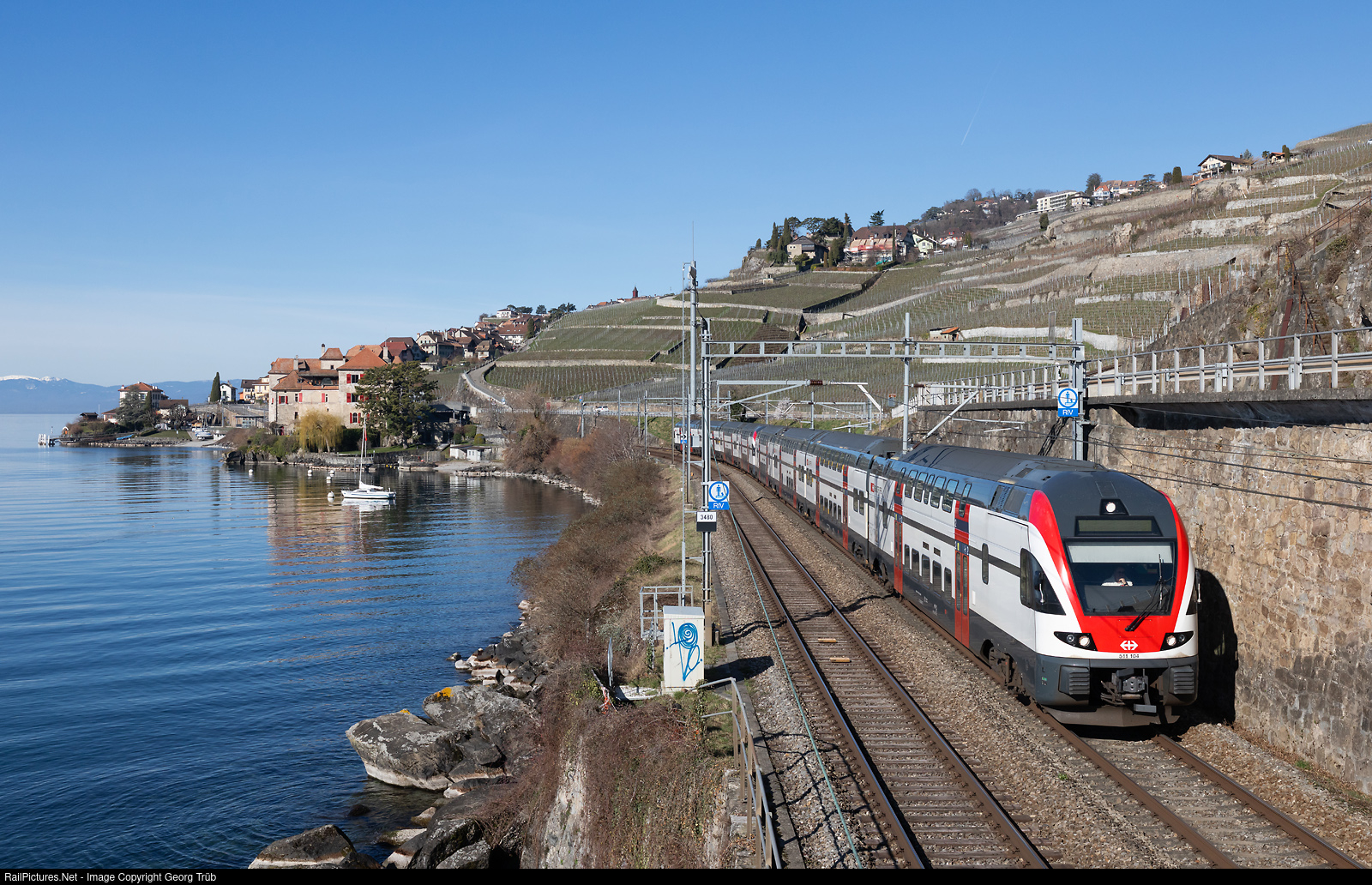 | The two coupled 4-car doubledeck trains RABe 511 # 104 and # 109 of the SBB in multiple control are running the RE33 service 18411 from Annemasse (France) via Geneva-Lausanne-Montreux to St-Maurice, between Rivaz and St-Saphorin along the shore of Lac Léman (Lake Geneva). |