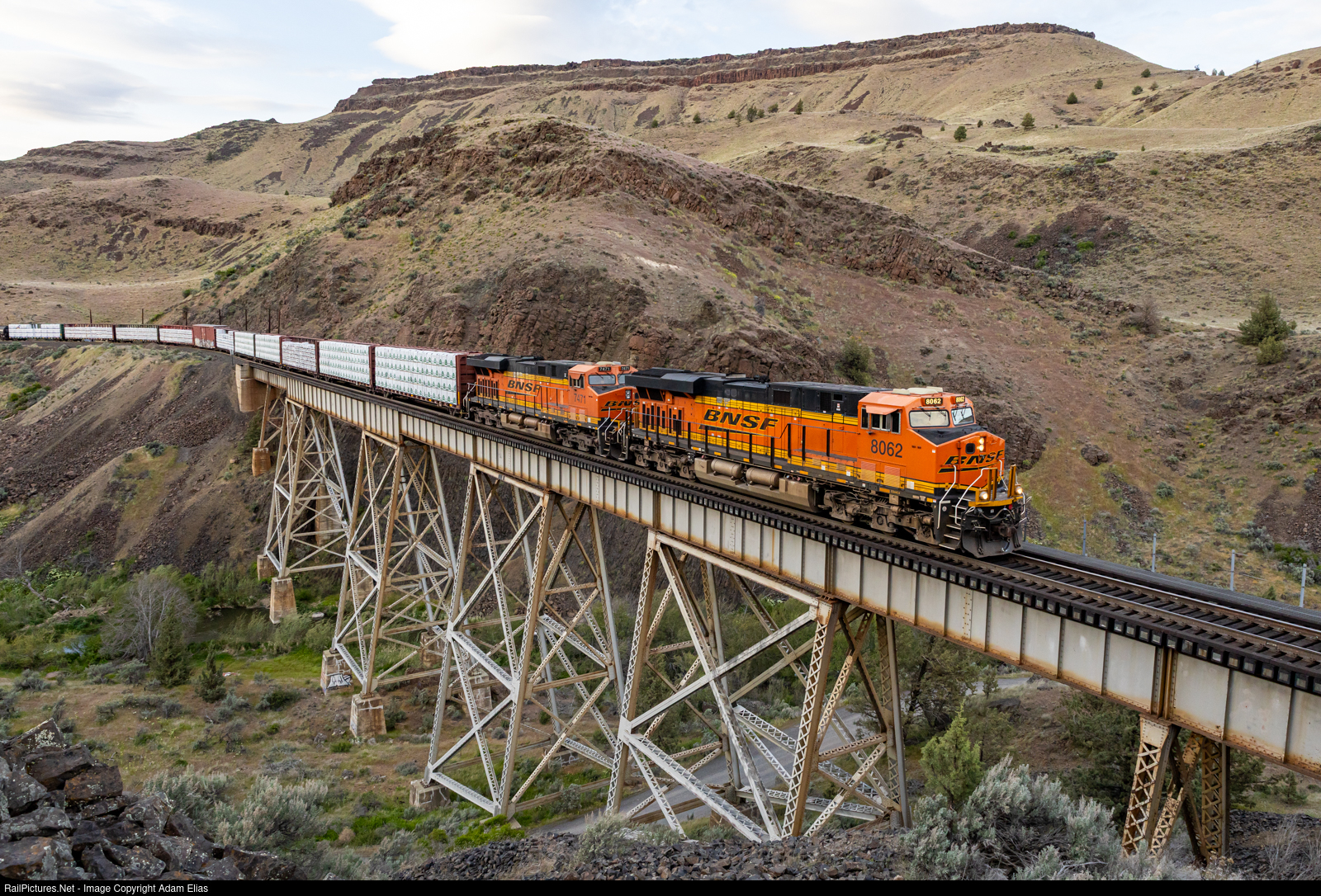 | BNSF HVAWFRS making their way across the Trout Creek trestle on the Oregon Trunk. This train is bound for Fresno. |