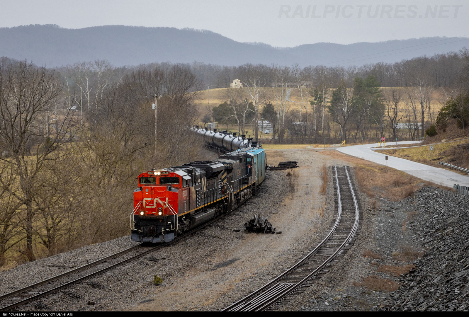 | A Canadian National SD70M-2 leads ethanol train NS 64M east through Bradshaw, VA on the Whitethorne district. The track to nowhere used to be the Bradshaw Spur where the trash local would go every night with Roanoke Co garbage. Now it is all trucked in. |