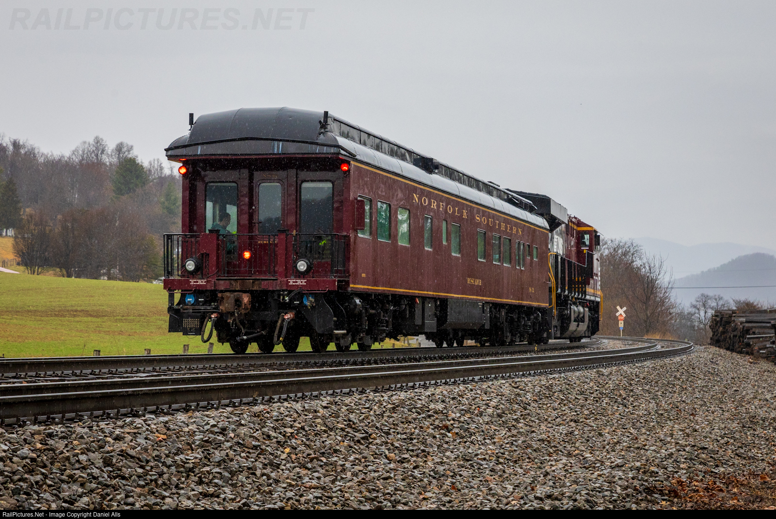 | Norfolk Southern’s newest “Landmark” paint locomotive, 8184, drifts downgrade through a rainy Shawsville with a research train. |