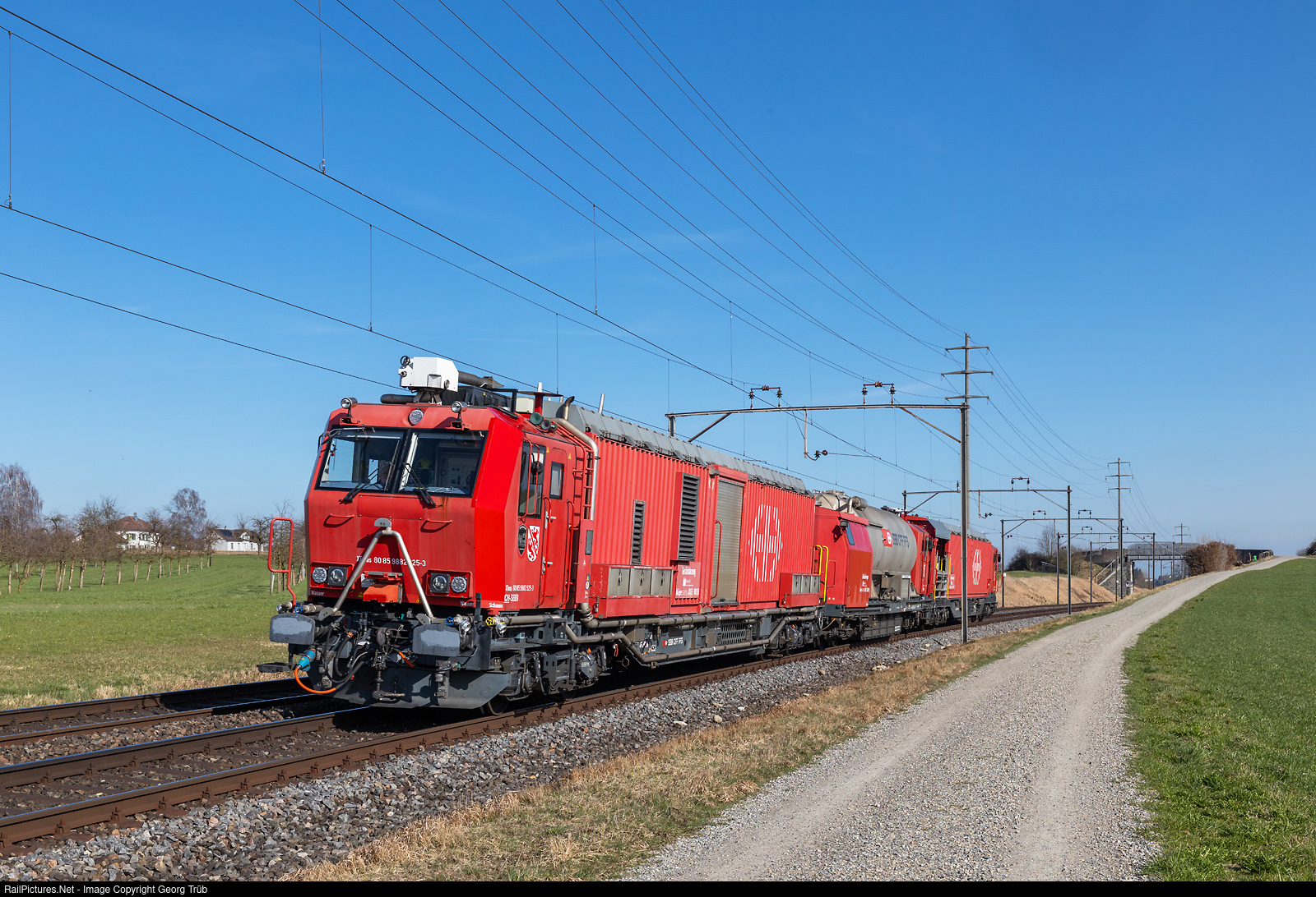 | Fire fighting and rescue train "LRZ 08" of Winterthur, with leading tools car XTmas 9882 # 925, is on the way from Romanshorn Süd to Winterthur, between Oberaach and Erlen. |