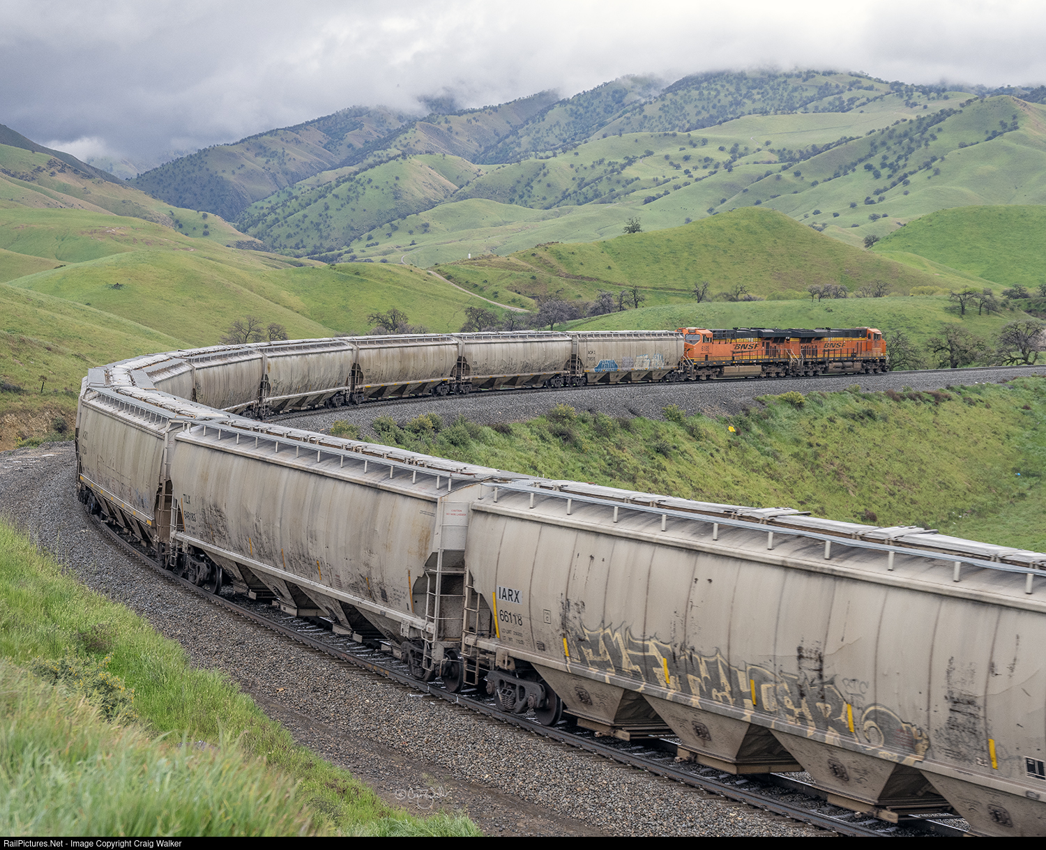 After exiting 151-year-old Tunnel 2 (built in 1875, lined in concrete in 1917) BNSF train G-MNXKIN5-11A, consisting of 100 covered hoppers hauling grain, winds through am S-curve as it descends the Union Pacific's Mojave Sub through the Tehachapi Mountains. This train originated in Mina, South Dakota, and is headed to Kings Park, in California's agricultural San Joaquin Valley (headed, possibly, to the Pitman Family Farms elevator complex in east Hanford).