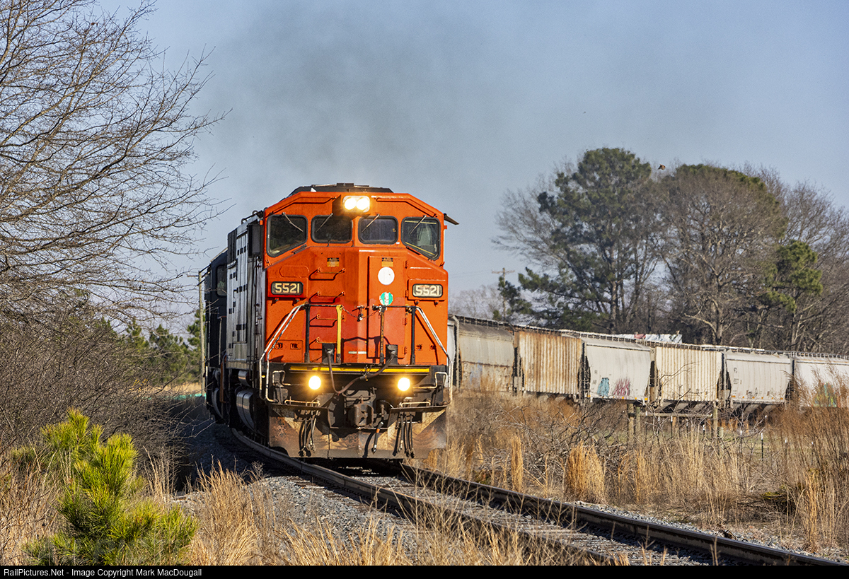 The bright orange nose of a patched ex-CN SD60F stands out approaching Candor with a grain train in tow.