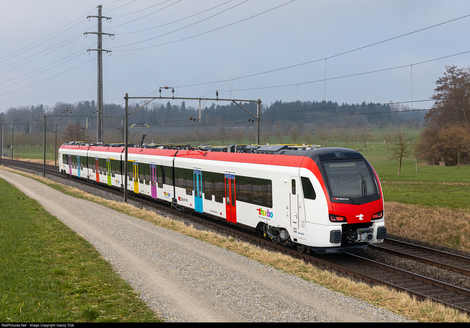 | Brand new "Flirt Evo" RABe 533 # 505 of the Thurbo is on the test run 97538 from Romanshorn VL to Sulgen, between Oberaach and Erlen. |