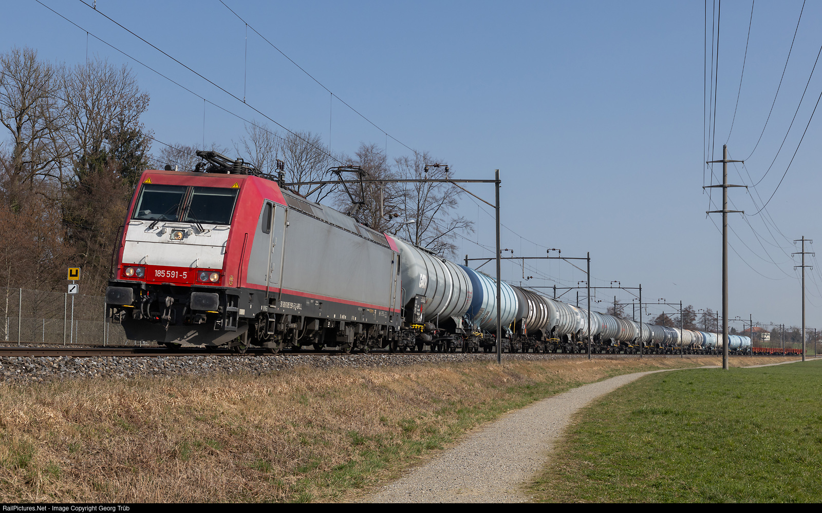 | Bombardier TRAXX F140 AC2 185 # 591 of the Beacon Rail Leasing, rented to the LTE, pulls the loaded tank car train 69662 from Buchs SG via St.Margrethen-Romanshorn VL to Winterthur freight yard (switchback, then probably to Schwarzenbach), between Oberaach and Erlen. In the rear of the train are 4 Res cars of the slovakian TSSC. |