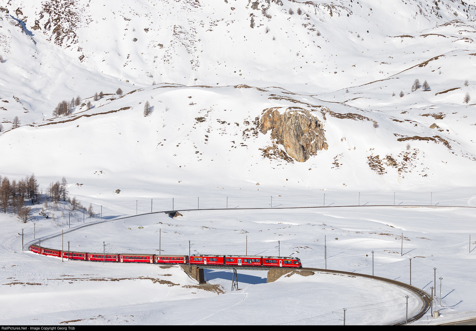 | "Allegra" ABe 8/12 # 3507 of the Rhaetian Railway pulls train 1617 of the line RE9 from St.Moritz over the Bernina pass to Tirano, crossing the upper Ova da Bernina bridge south of the Alp da Buond Sur between Bernina Lagalb and Ospizio Bernina. The large curve over the Alp da Buond Sur was built in 1934 only, before the line was along the Bernina pass road on the foot of the Piz Lagalb. |