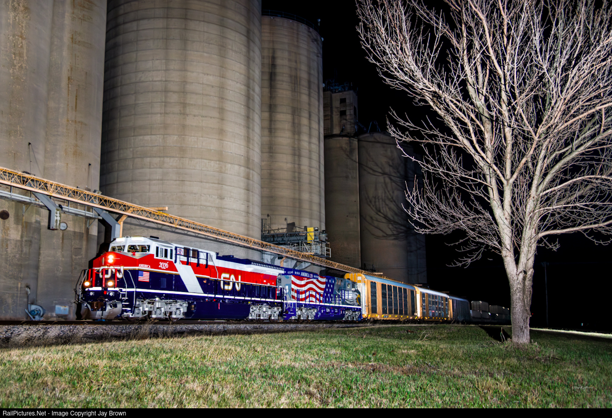 | Painted in celebration of the 250th year since the creation of the United States of America, the hotshot Chicago to New Orleans intermodal races through Ludlow under the cover of darkness. This was CN 2026’s maiden voyage in the lead. |