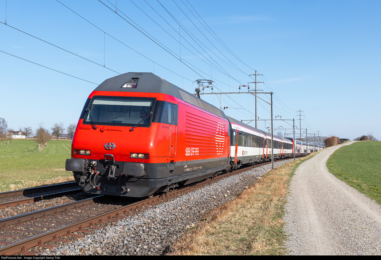 | The perfectly clean Re 460 # 116 “Ostschweiz” is at the front of IC 826 on the IC81 line from Romanshorn via Winterthur-Zurich-Bern-Thun to Interlaken Ost, traveling between Oberaach and Erlen. The train has a “module” of three single-deck Type IV standard cars at the front, followed by the 9-car double-deck push-pull train “IC2000” with the Re 460 # 107 locomotive at the rear. |