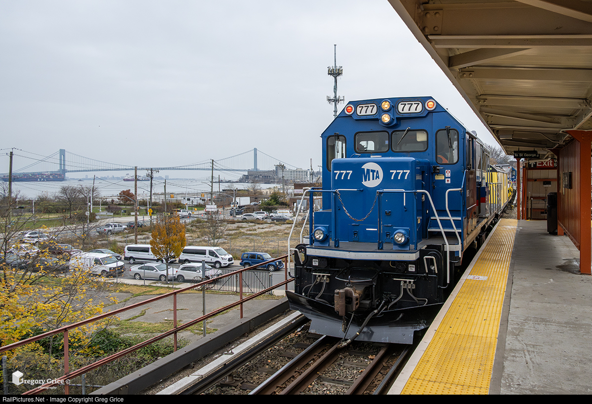 On November 21st, 2025, Staten Island Railway’s “Wash Train” pulls into Stapleton station on Staten Island, New York. The Verrazzano-Narrows Bridge can be seen in the background. The Wash Train, comprising a former New York City Transit R22 subway car (SIR RD344) and sprayer flatcar (SIR OF663) sandwiched between two Brookville BL20G locomotives (BMEX 777 and BMEX 778), is dispatched by SIR during leaf season as a backup to the LaserTrain to help clear debris from the rails.