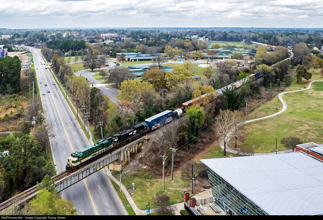 | Finally Arriving! Due to yard congestion (I think), 15R had to wait quite awhile (and so did I) before it could proceed through town into Andrews Yard. Here, it passes over Harden Street as it proceeds down the Southern's old R Line through Columbia. I've photographed a train on this bridge twice and the SOU has been the subject both times--the first trailing and now leading. |