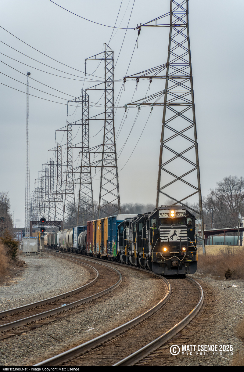 Norfolk Southern 5279 is the first of a quartet of GP38-2 locomotives seen leading train K76 towards Bound Brook Station, returning to Jersey City after a trip out to Allentown, PA. |