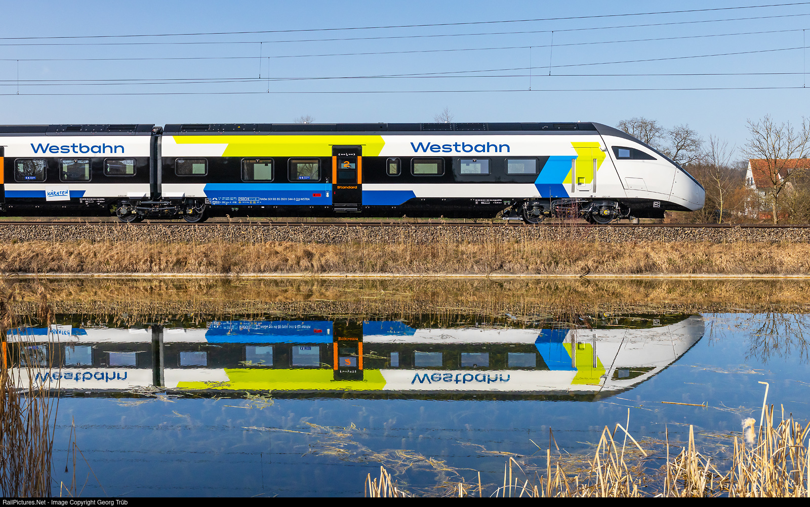 For my 20'000th photo on Railpictures.net, I chose one from one of my favorite photo spots, the pond in Riedt near Erlen in the Thur Valley. The new 202 meter long SMILE high-speed train for 250 km/h from StadlerRail for the austrian Westbahn, RABe 501 # 044, is reflected as it passes by on its way back from test runs to the StadlerRail commissioning center in Erlen. Westbahn has ordered three of these trains, leased for six years, for use from Vienna via the Semmering to Graz and on via the newly opened Koralmbahn to Klagenfurt and Villach. When the Semmering Base Tunnel opens in around 2031, allowing double-decker trains to be used on this route, Westbahn will have the option of extending the contract, purchasing the trains, or returning them to the manufacturer.