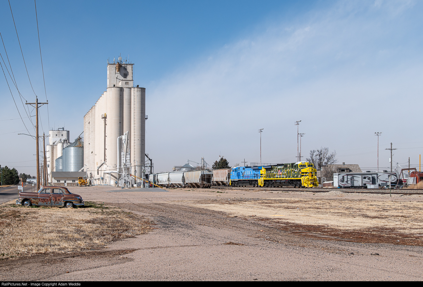 | KYLE 4461 leads the Limon to Salina freight past the elevator at Burlington. It is a shame that the classic car in the left corner of the frame is not in better shape. |