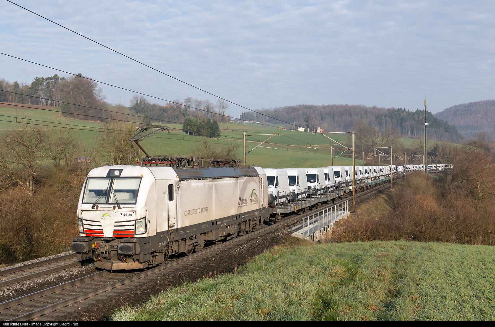 | The Siemens "Vectron" 7193 # 301 of the TXLogistik, part of the Mercitalia group, pulls the southbound car transport train 48657 from Düsseldorf/Germany via Basel-Bözberg-Gotthard mountain line !-Bellinzona-Chiasso to Alessandria/Italy. The train transports new Mercedes "Sprinter" vans of different types. The gross load of the 520 meter long train was about 650 tons. |