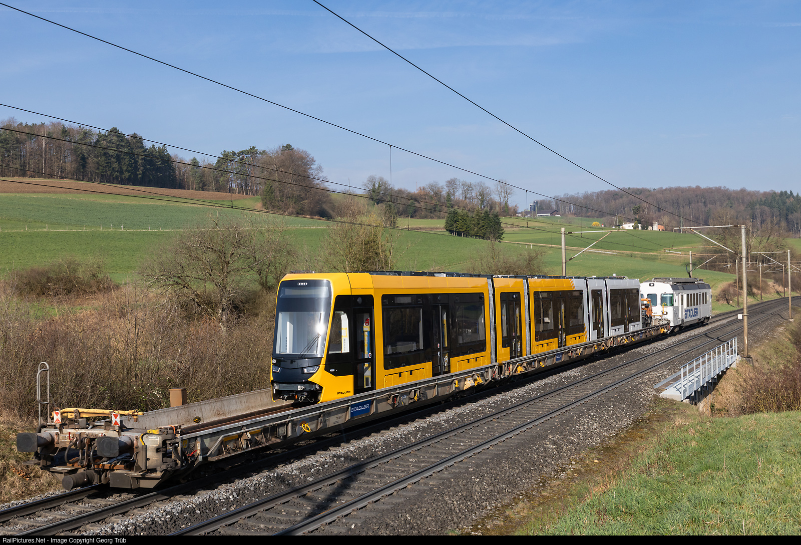 | The white railcar RBDea 567 # 173 of StadlerRail pulls the streetcar transport train 44080 from Bussnang via Weinfelden-Winterthur-Kloten-Regensdorf-Brugg to Basel Bad Bf, on the Bözberg line between Effingen and Hornussen. On the three "Rolling Highway" lowfloor cars of StadlerRail is the TINA streetcar # 602 for the town of Gera in Germany, one of six ordered. |