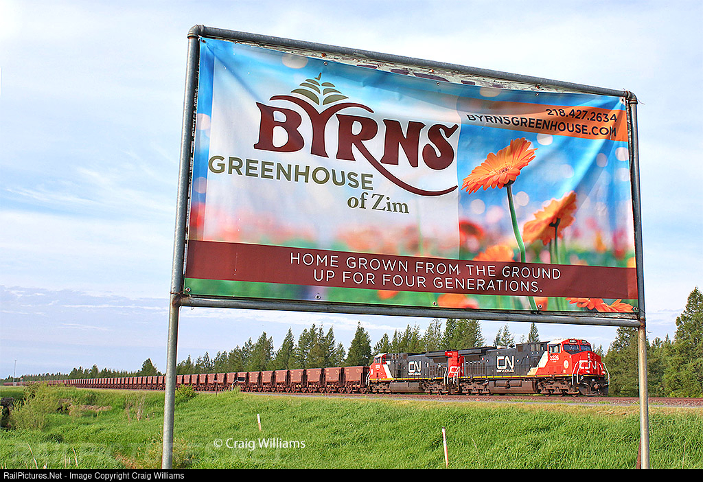 | An empty ore train bound for the United Taconite Plant at Fairlane passes this nice greenhouse near MP 52 on the Missabe Sub. The ACs have really taken over the Iron Range now; while nice and new, it does not have the curb appeal that once was. |