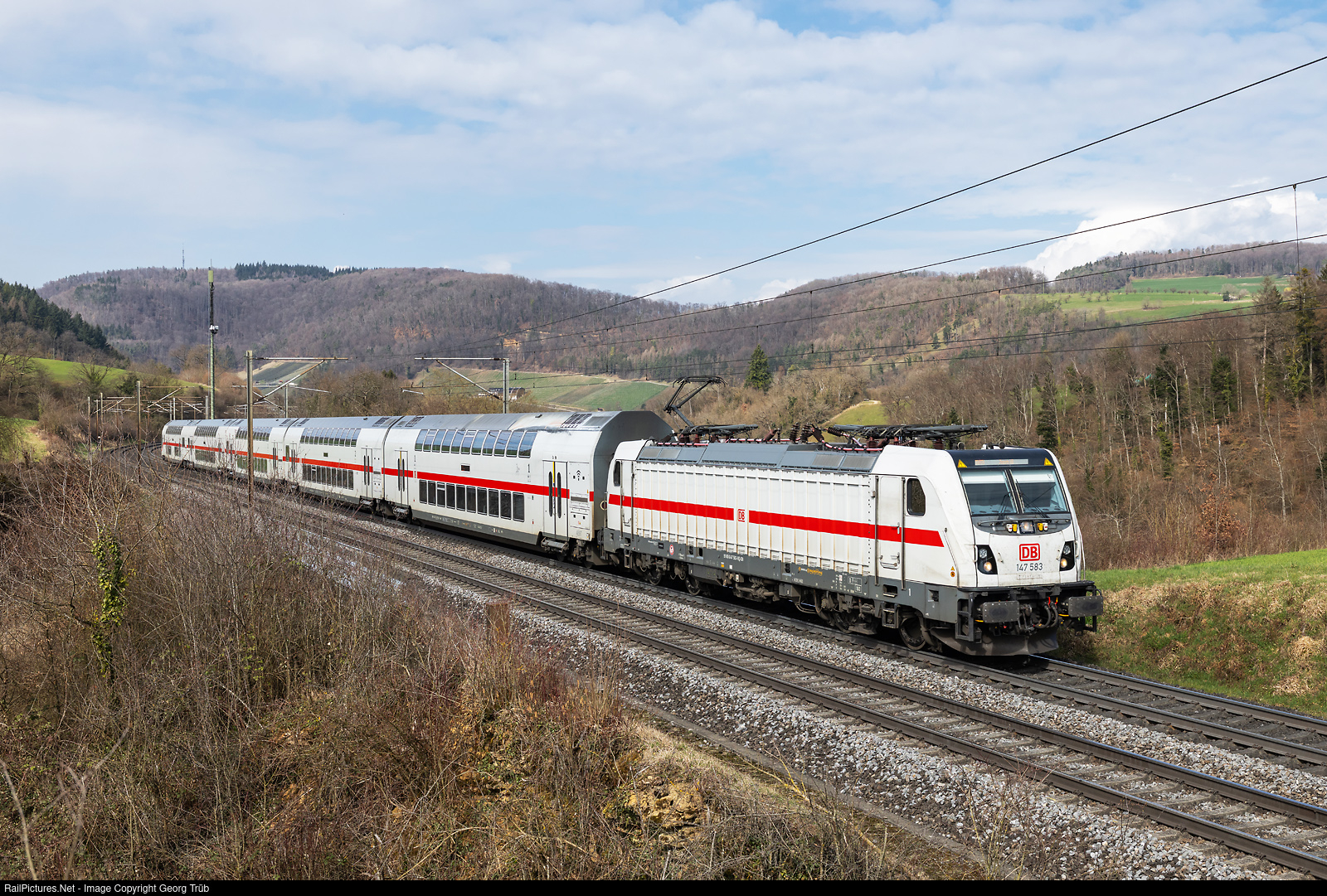 | Double-decker Intercity push-pull trains operated by Deutsche Bahn with Bombardier class 147 locomotives run on the route between Zurich and Stuttgart via Schaffhausen-Singen-Horb. For maintenance at the DB depot in Basel Badischer Bahnhof, the trains are moved between Zurich and Basel SBB and vice versa as Interregio IR36. The Bombardier TRAXX P160 AC3 147 # 583 pulls the IR 1971 of the IR36 line from Basel to Zurich between Hornussen and Effingen on the Bözberg North ramp.